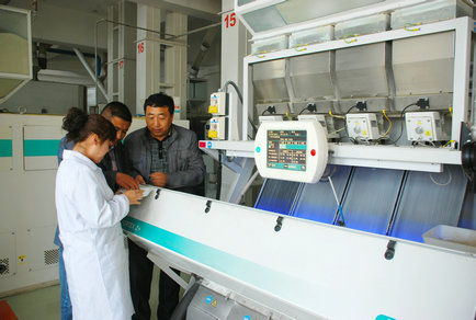 圖為工作人員正在測(cè)試色選機(jī)工藝指標(biāo)。