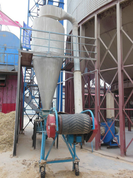 怎么解決這一問(wèn)題呢?2014年10月以車(chē)間主任陳慶斌為首的烘干車(chē)間工人,積極出主意想辦法,根據(jù)他們多年的工作經(jīng)驗(yàn)和智慧,充分利用報(bào)廢設(shè)備上的舊風(fēng)機(jī)、關(guān)風(fēng)器、剎克龍、皮帶輪、主風(fēng)管零部件和廢舊角鐵、鐵板等邊角料等,自行研制了我們稱之為“水稻清理風(fēng)選機(jī)”,就是用風(fēng)選的方式把雜質(zhì)清理出來(lái),作為圓筒清理(初清)篩的附加清選設(shè)備,同時(shí)還自制了4米水稻雜質(zhì)皮帶輸送清理機(jī)和10米風(fēng)管。