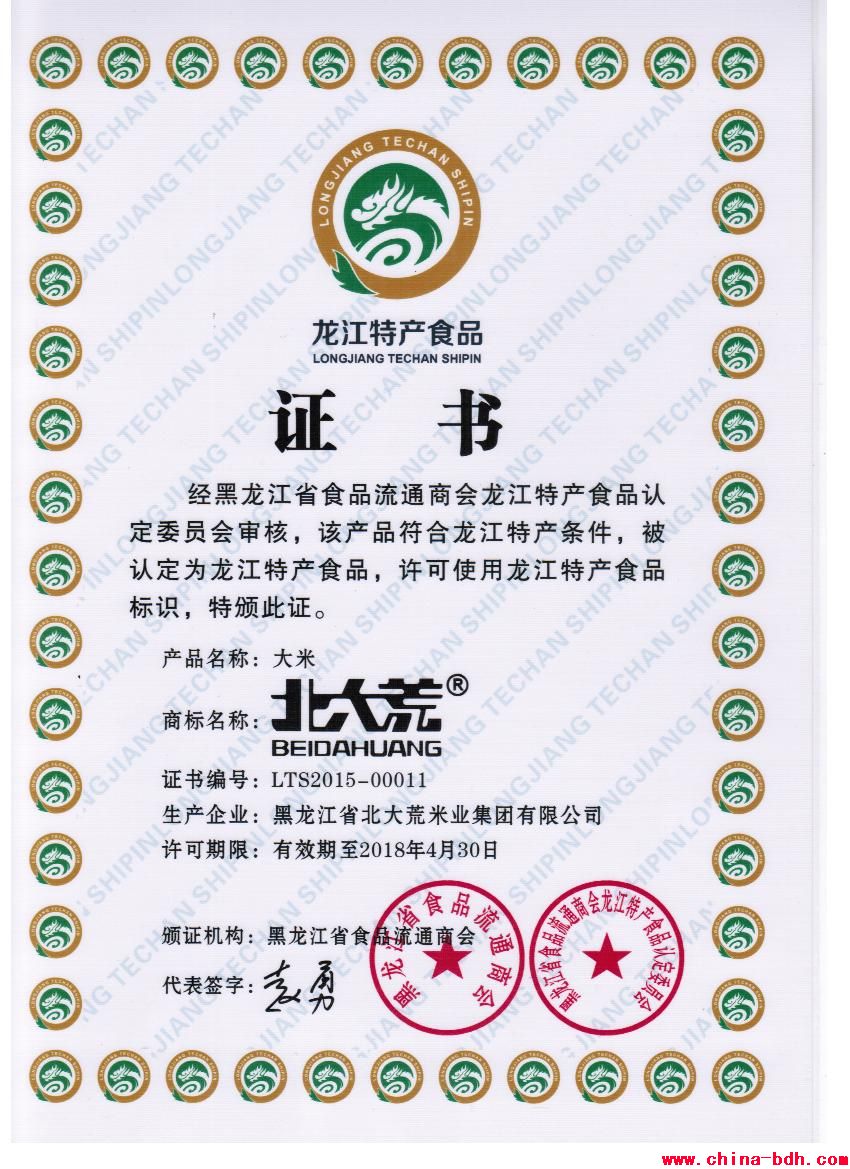 北大荒大米榮獲龍江特產食品證書