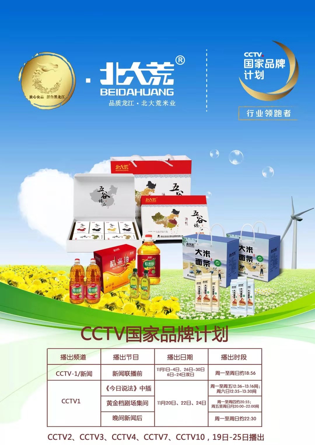 在中國經濟步入新常態、供給結構性改革進入關鍵期的大背景下,北大荒集團緊跟時代脈博,成功攜手CCTV國家品牌計劃,將于11月1日于CCTV一1/新聞聯播前、《今日說法》中插、黃金檔劇場集間、晚間新聞后、及CCTV2、CCTV3、CCTV4、CCTV7、CCTV10等頻道開播,排期至11月30日。