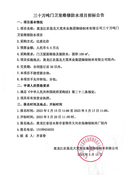 黑龍江農(nóng)墾北大荒米業(yè)集團御綠制米有限公司三十萬噸門衛(wèi)室維修防水項目招標(biāo)公告