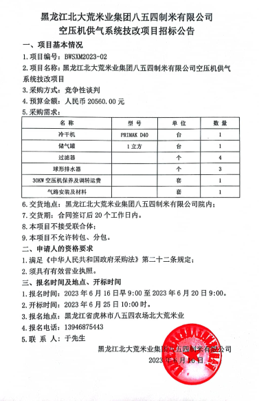 北大荒米業(yè)八五四公司空壓機(jī)供氣系統(tǒng)技改項目招標(biāo)公告