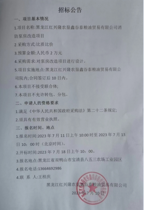 黑龍江紅興隆農墾鑫谷泰糧油貿易有限公司消防泵房改造項目招標公告