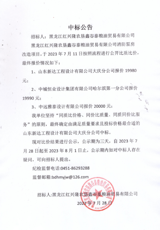 黑龍江省紅興隆農(nóng)墾鑫谷泰糧油貿(mào)易有限公司消防泵房改造項目中標公告