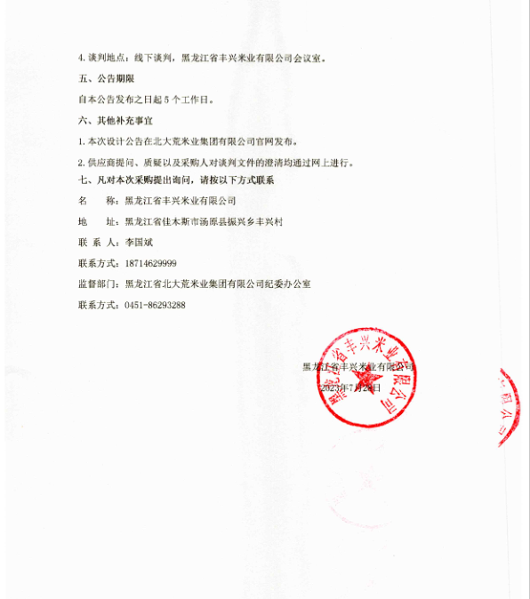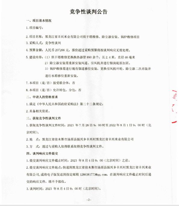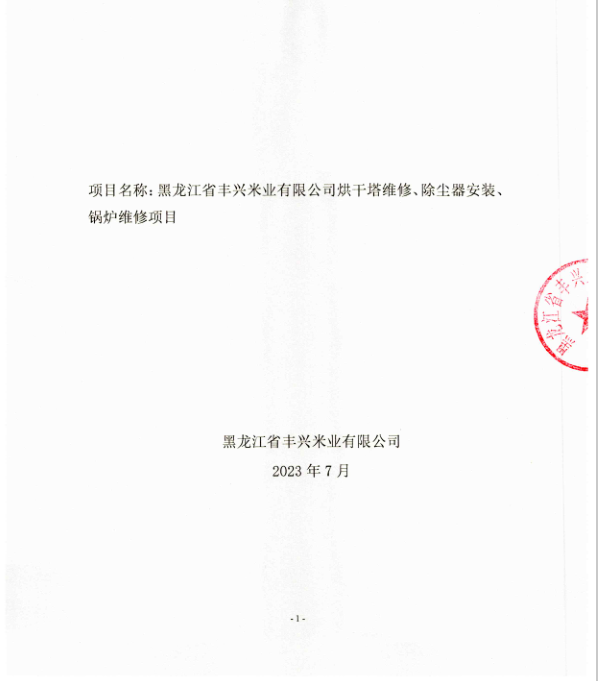 黑龍江省豐興米業有限公司烘干塔維修、除塵器安裝、鍋爐維修項目招標公告
