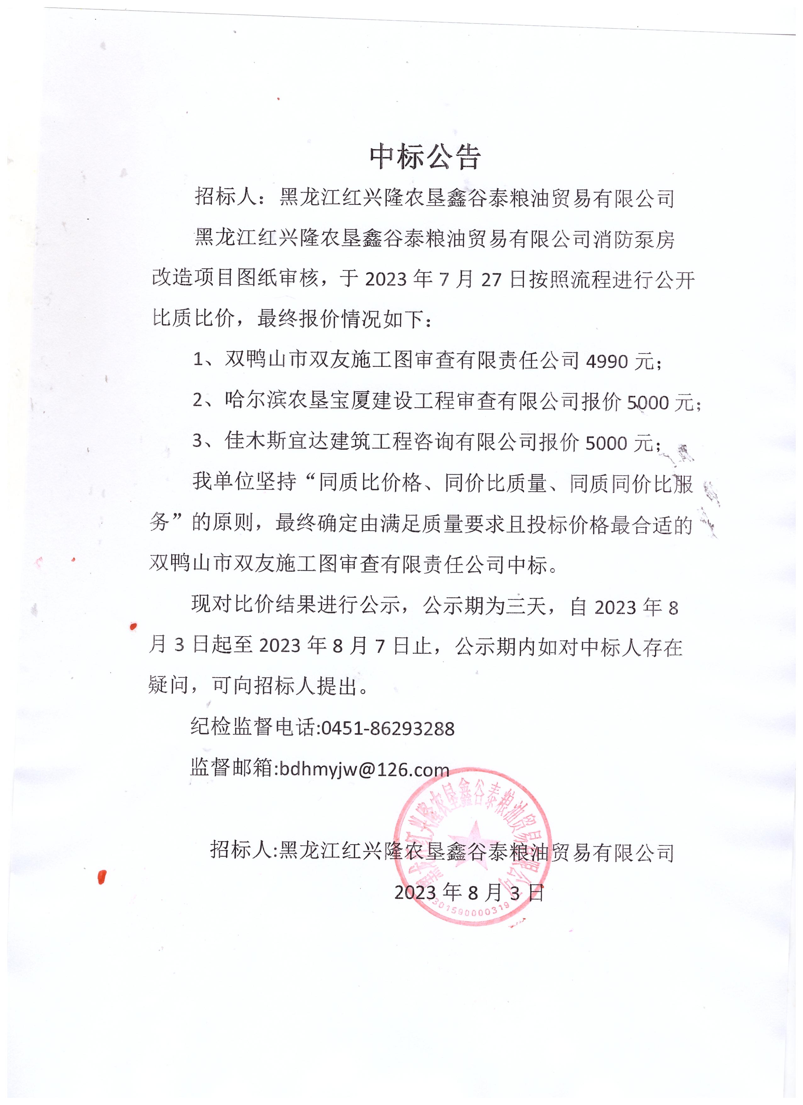 黑龍江紅興隆鑫谷泰糧油貿(mào)易有限公司消防泵房改造項(xiàng)目圖紙審核中標(biāo)公告