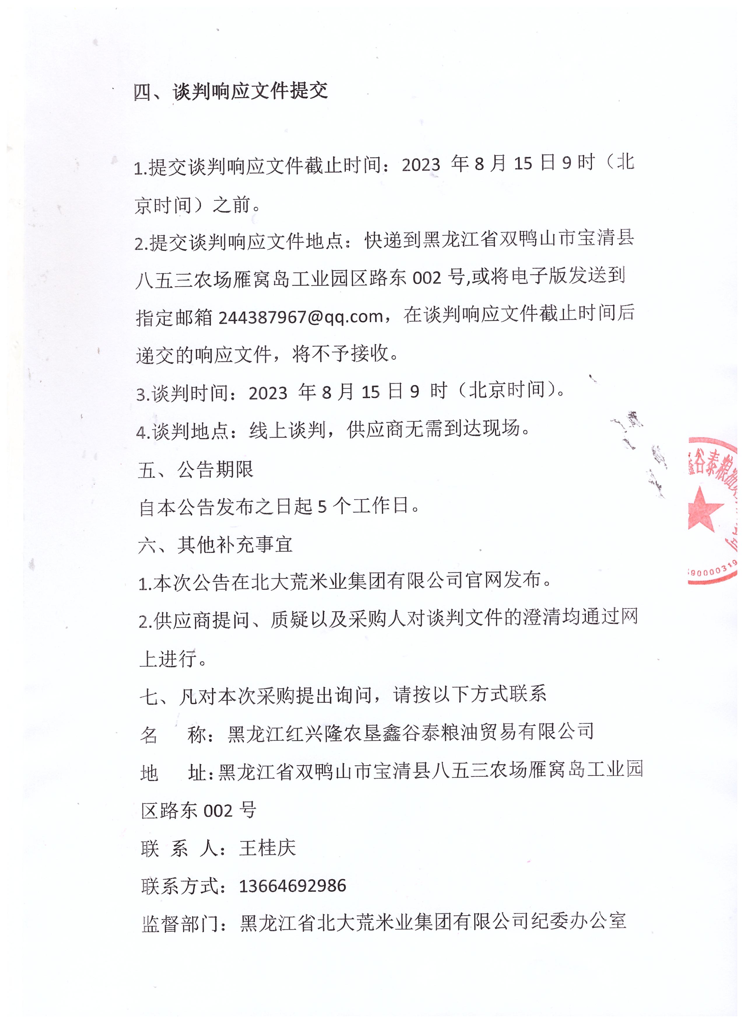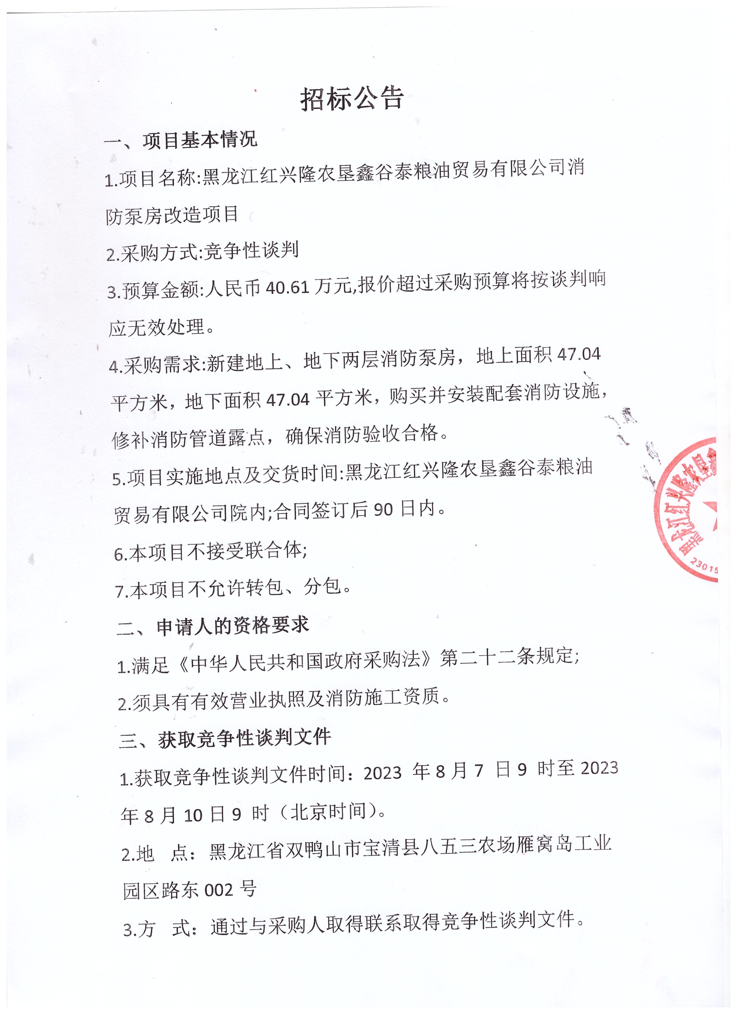 黑龍江紅興隆農(nóng)墾鑫谷泰糧油貿(mào)易有限公司消防泵房改造項(xiàng)目招標(biāo)公告
