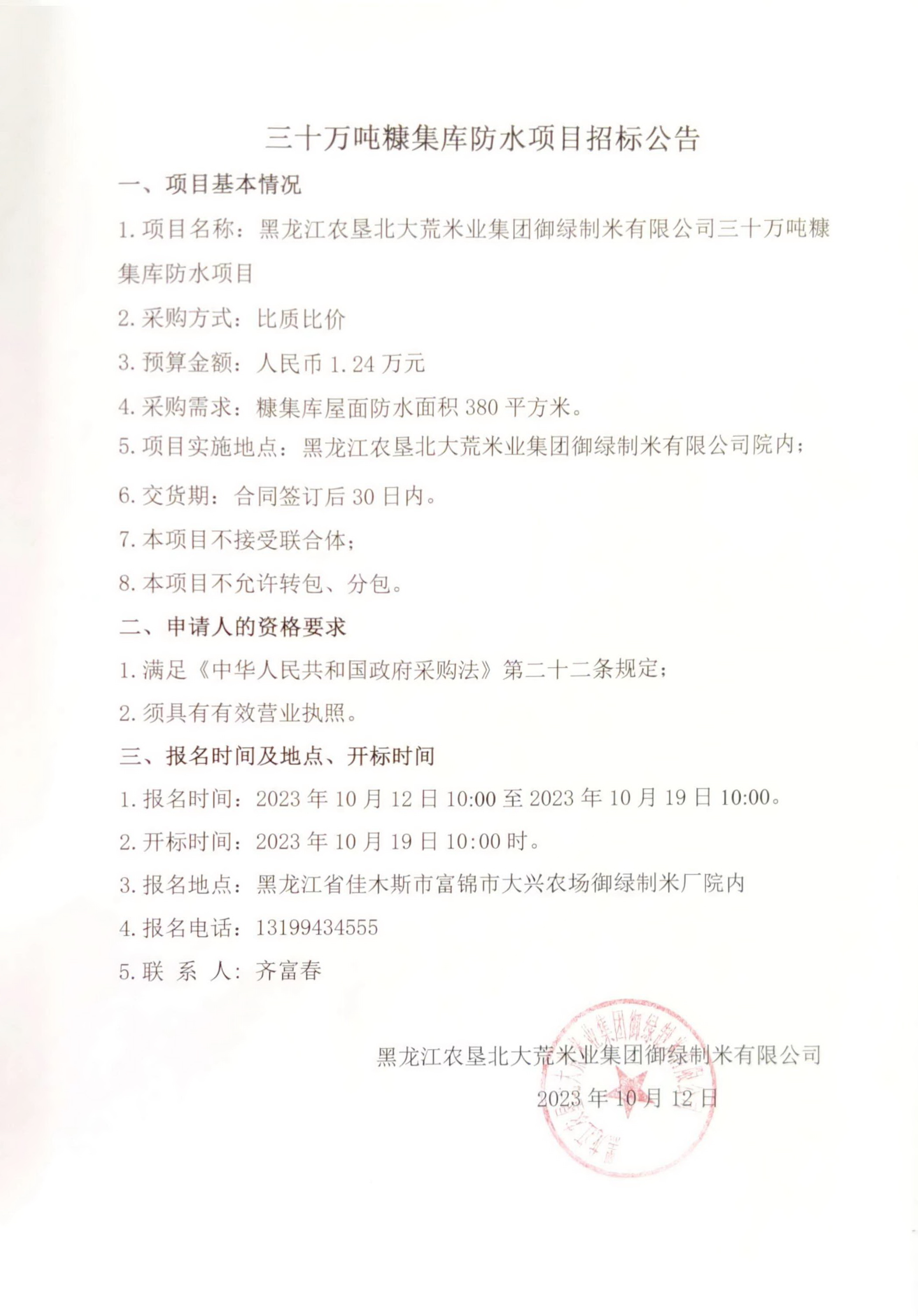 黑龍江農墾北大荒米業集團御綠制米有限公司三十萬噸糠集庫防水項目招標公告