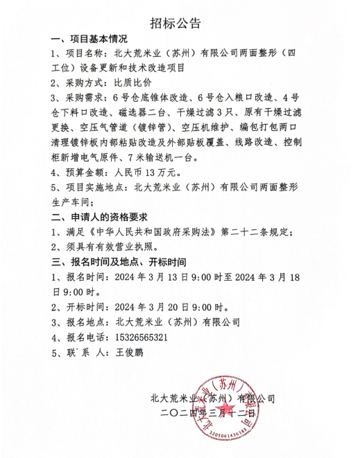 北大荒米業(yè)(蘇州)有限公司兩面整形(四工位)設(shè)備更新和技術(shù)改造項(xiàng)目招標(biāo)公告