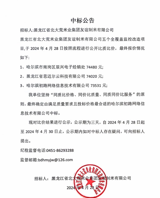 北大荒米業友誼公司五個全覆蓋監控改造項目中標公告