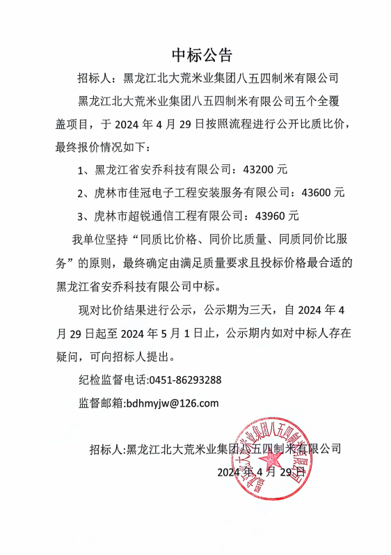 北大荒米業854制米公司五個覆蓋安裝采購項目中標公告