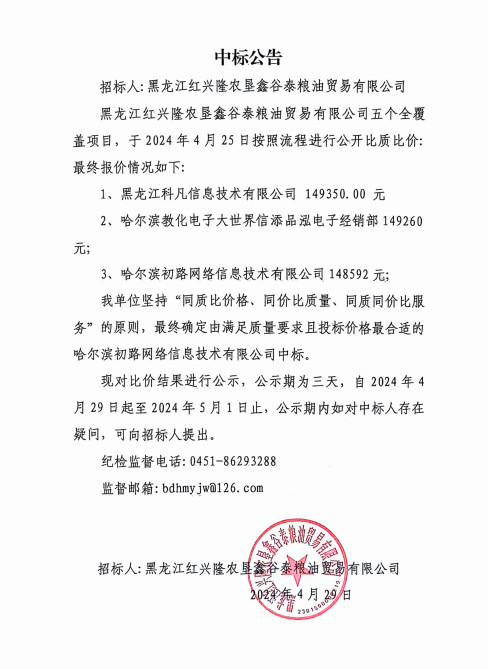 黑龍江紅興隆農墾鑫谷泰公司五個全覆蓋項目中標公告