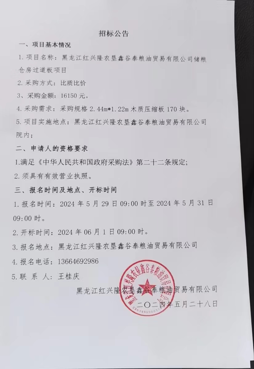 黑龍江紅興隆農墾鑫谷泰糧油貿易有限公司糧儲倉房過道板項目招標公告