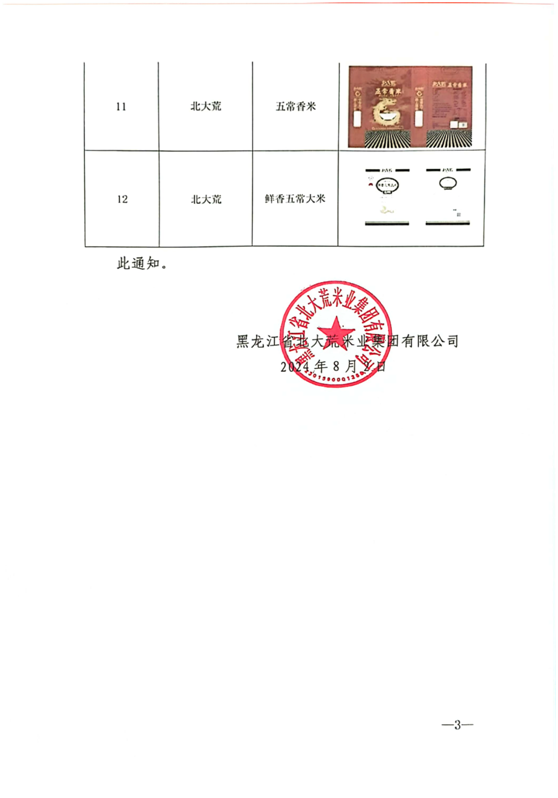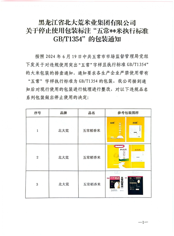 關于停止使用包裝標注“五常**米執行標準GB/T1354”的包裝通知