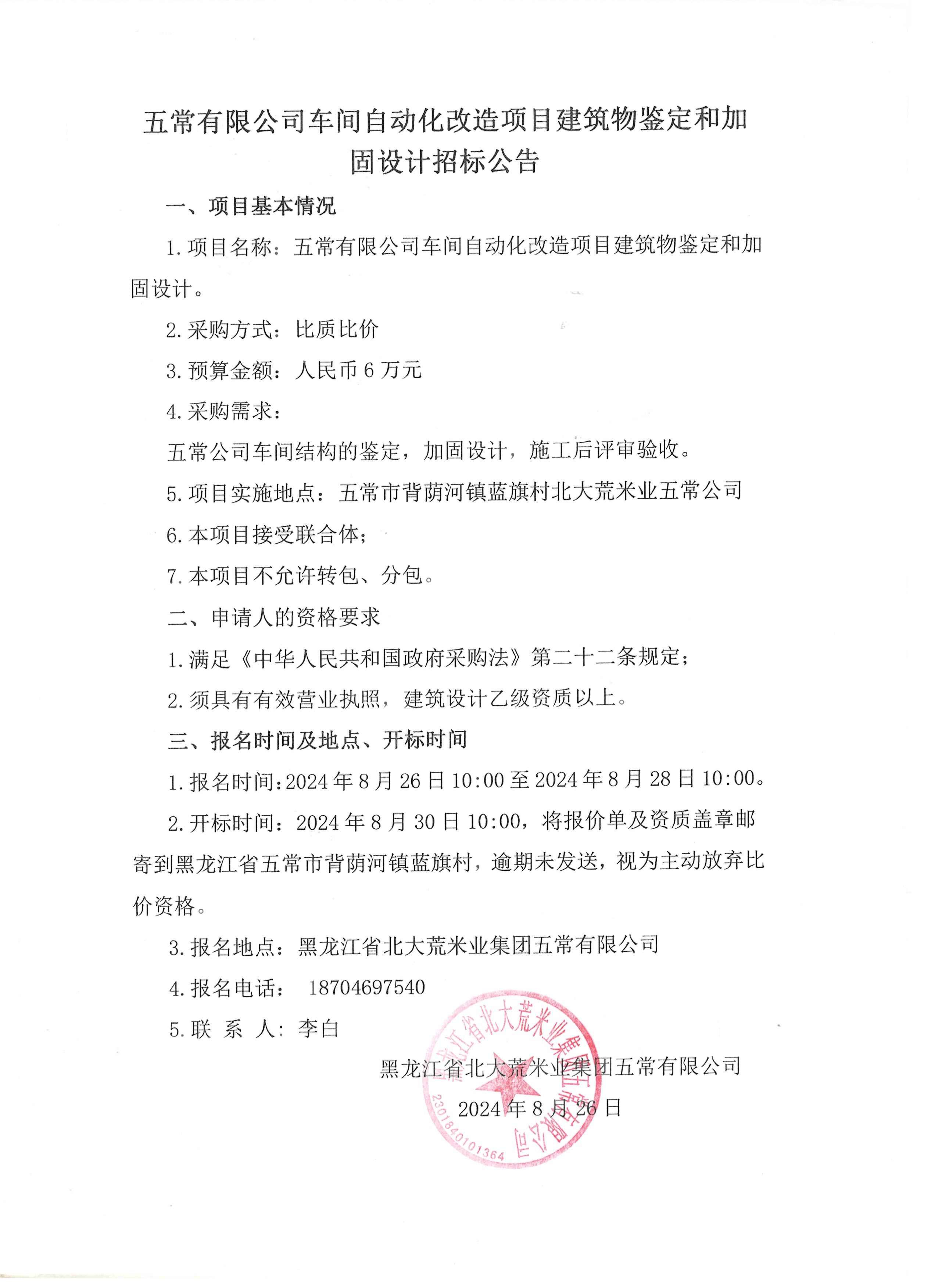 五常有限公司車間自動(dòng)化改造項(xiàng)目建筑物鑒定和加固設(shè)計(jì)招標(biāo)公告