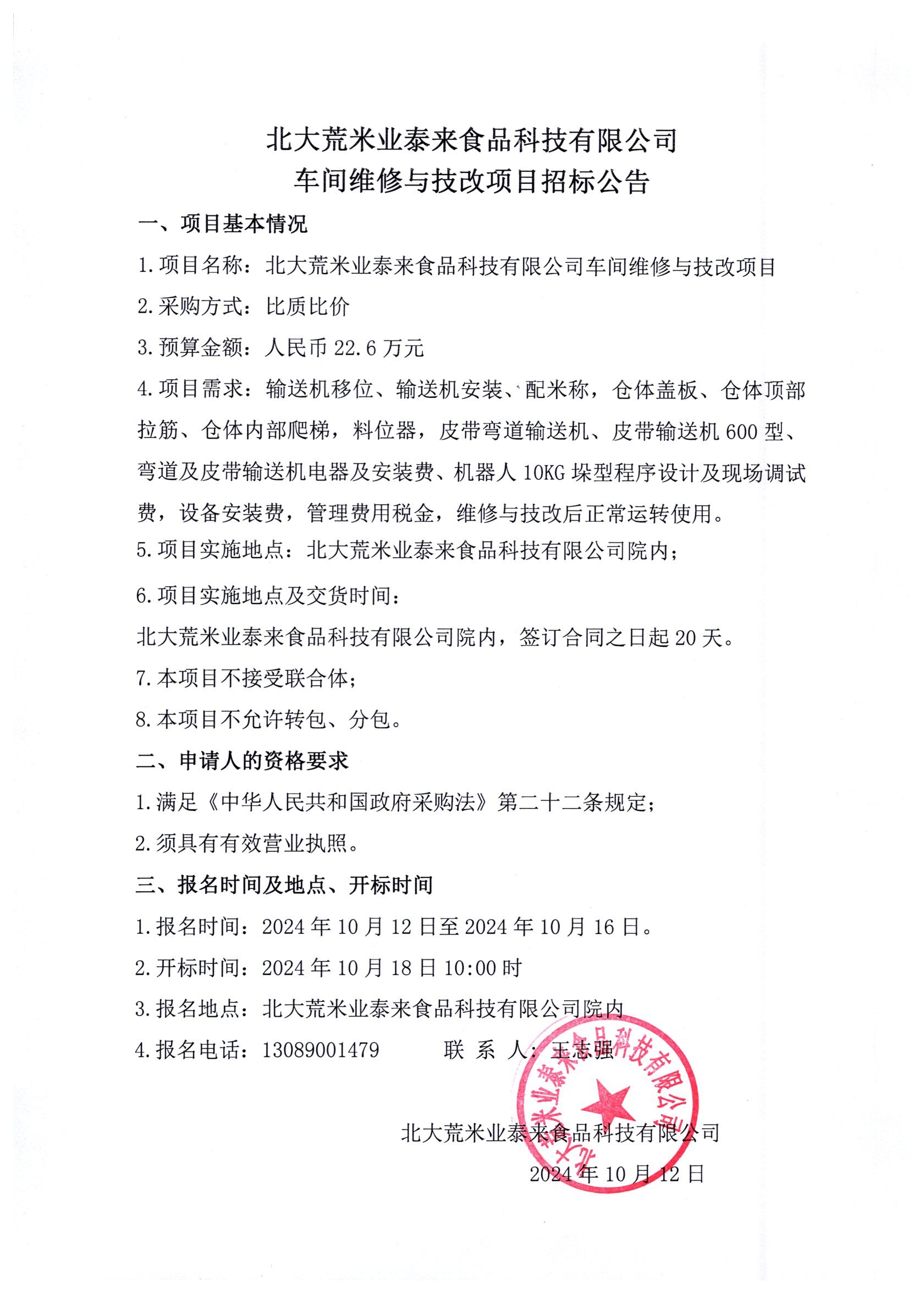 北大荒米業泰來食品科技有限公司車間維修與技改項目招標公告