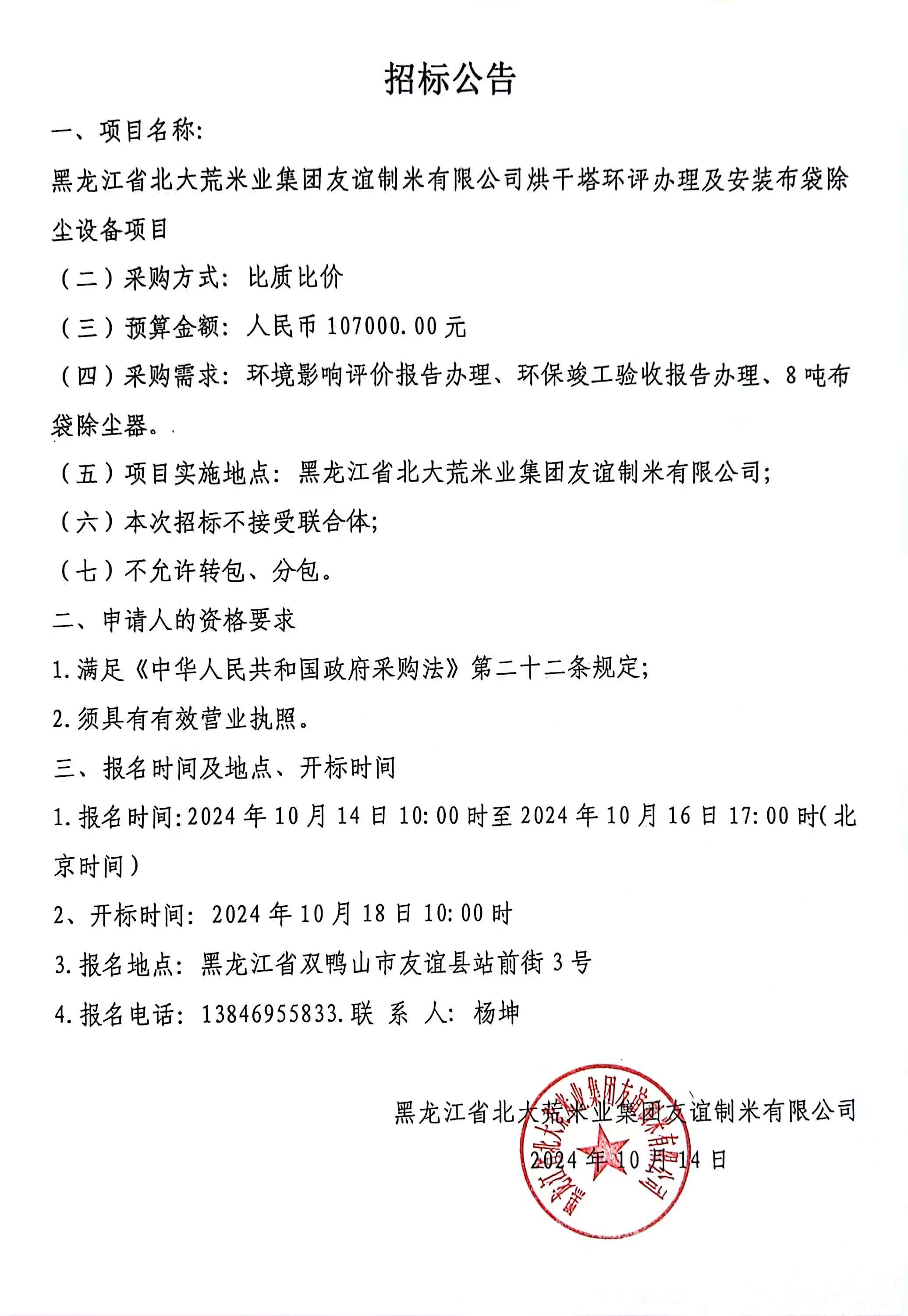 黑龍江省北大荒米業集團友誼制米有限公司烘干塔環評辦理及安裝布袋除塵設備項目招標公告