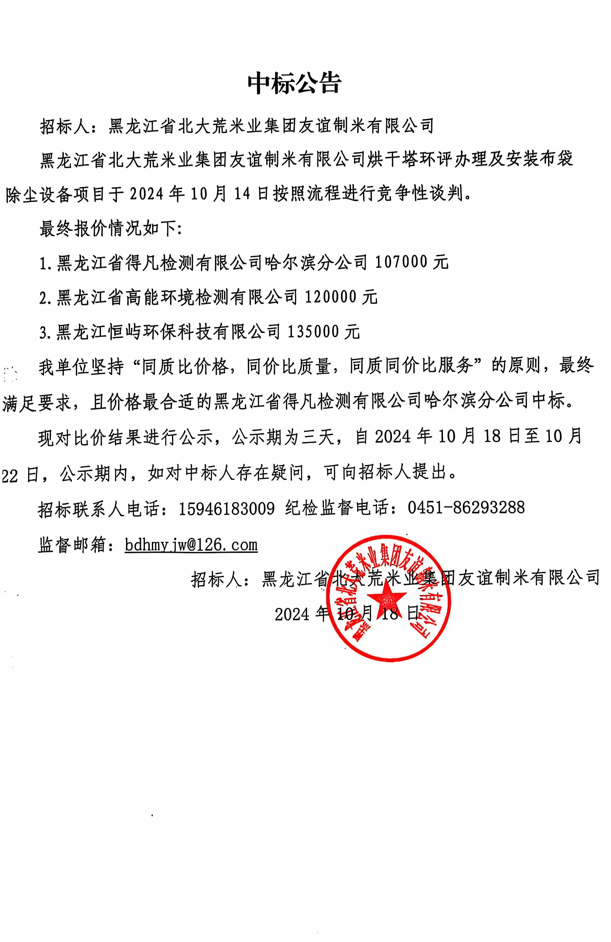 友誼制米有限公司烘干塔環(huán)評(píng)辦理及安裝布袋除塵設(shè)備項(xiàng)目中標(biāo)公告