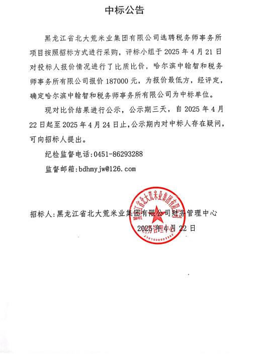 黑龍江省北大荒米業集團有限公司選聘稅務師事務所項目中標公告