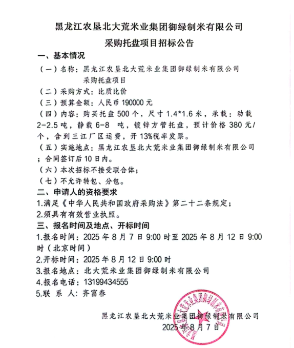 黑龍江省北大荒米業集團御綠制米有限公司采購托盤項目招標公告