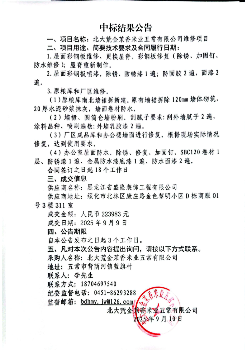 北大荒金茉香米業(yè)五常有限公司維修項目中標(biāo)公告