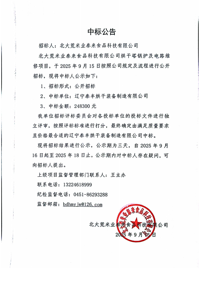 北大荒米業(yè)泰來(lái)食品科技有限公司烘干塔鍋爐及電路維修項(xiàng)目中標(biāo)公告