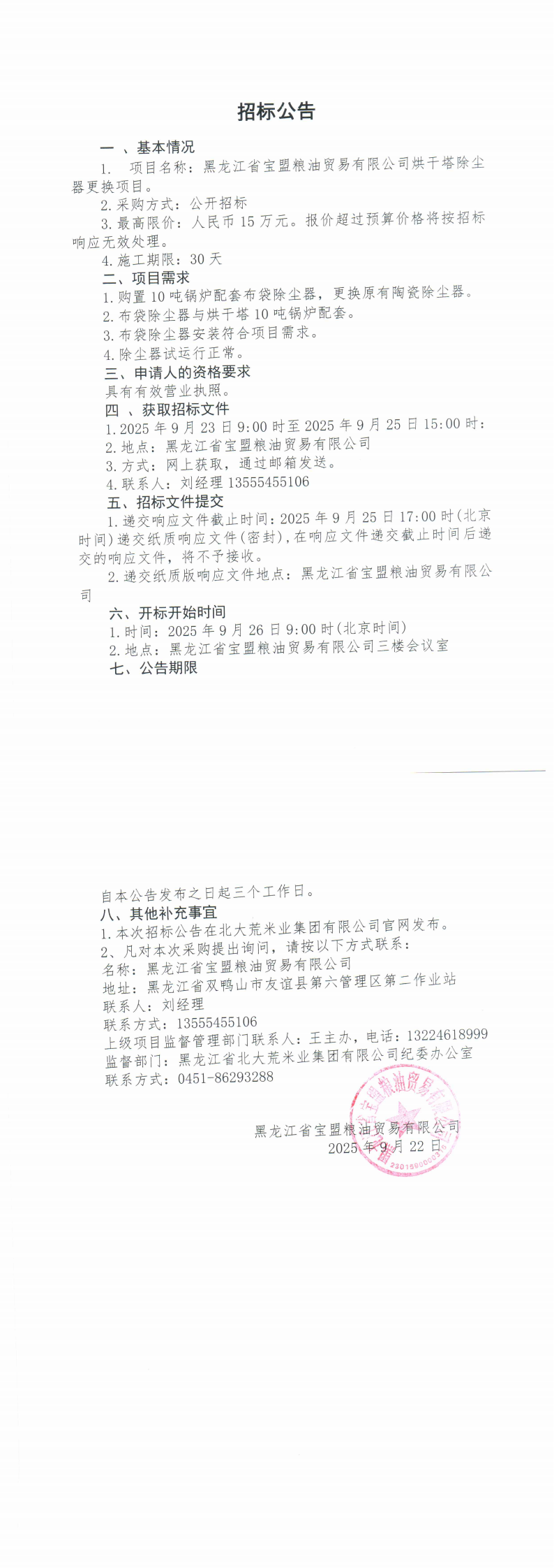 黑龍江省寶盟糧油貿易有限公司烘干塔除塵器更換項目招標公告