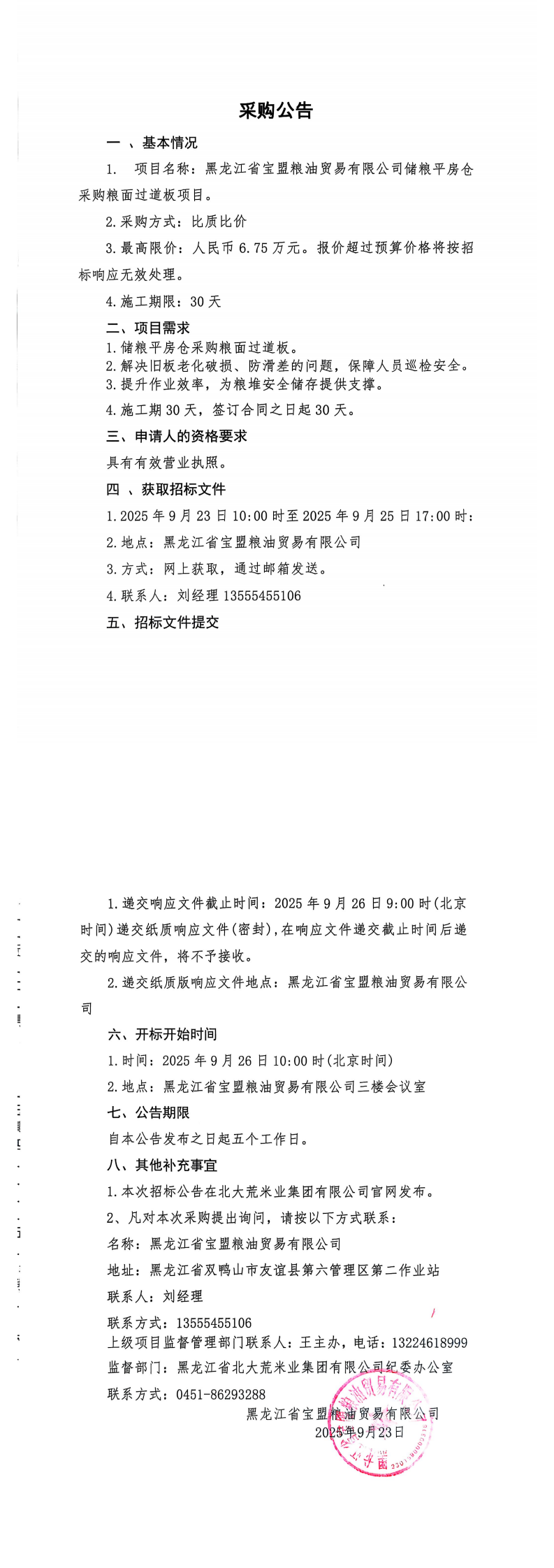 黑龍江省寶盟糧油貿易有限公司儲糧平房倉采購糧面過道板項目招標公告