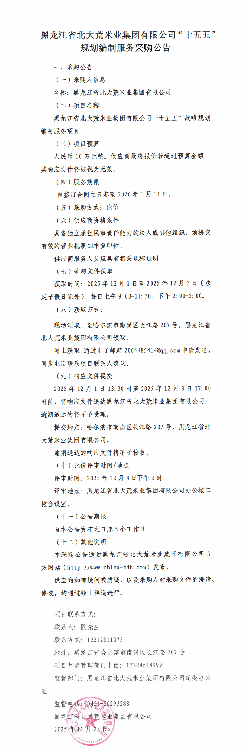 黑龍江省北大荒米業(yè)集團(tuán)有限公司“十五五”規(guī)劃編制服務(wù)采購公告