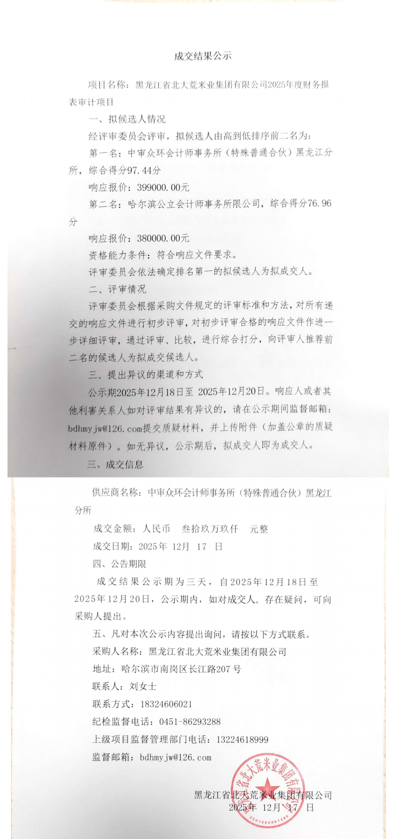 北大荒米業(yè)集團(tuán)有限公司2025年度財(cái)務(wù)報(bào)表審計(jì)項(xiàng)目成交公告