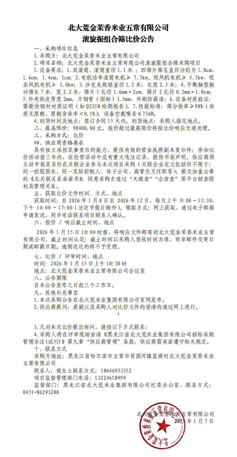 北大荒金茉香米業(yè)五常有限公司滾旋震組合篩采購公告