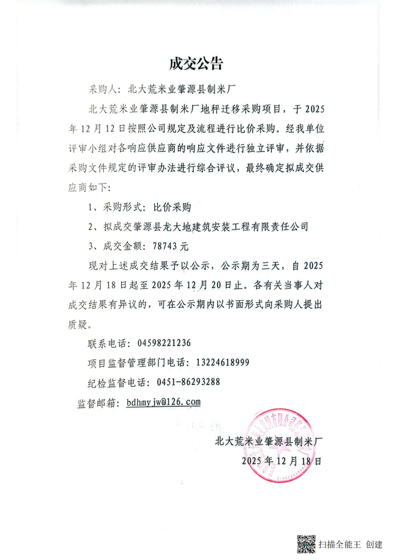 北大荒米業集團肇源縣制米廠地秤遷移項目成交公告