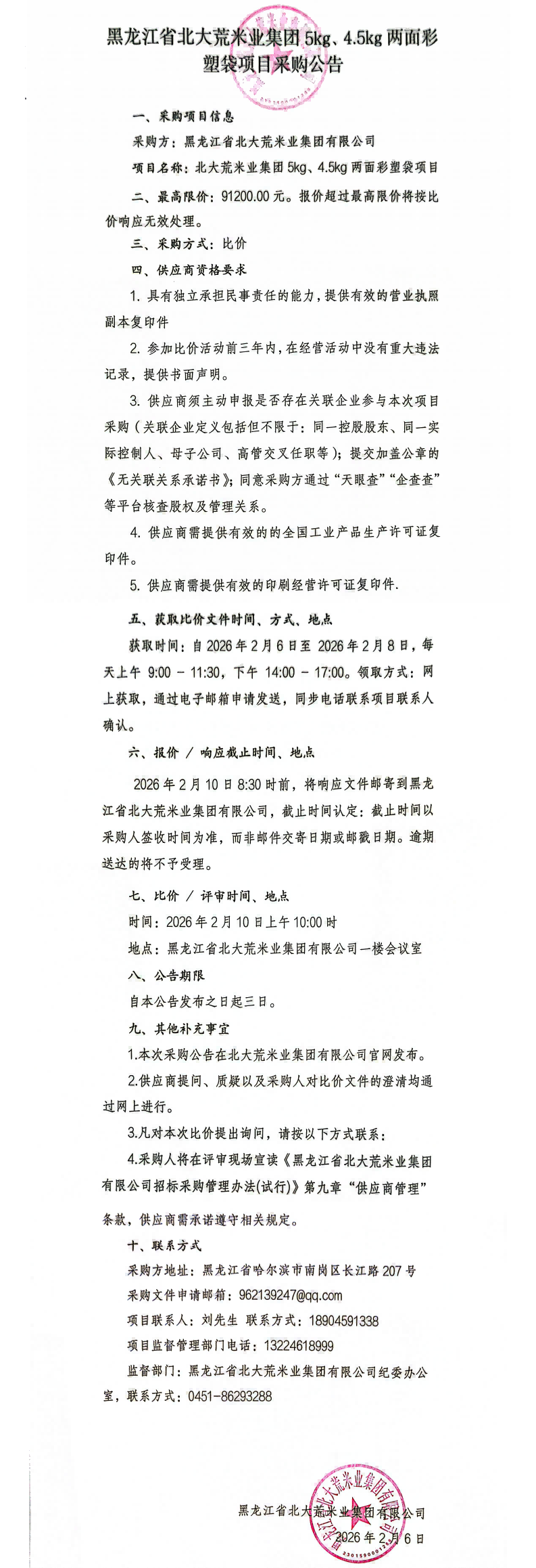 黑龍江省北大荒米業集團5kg、4.5kg兩面彩塑袋項目采購公告