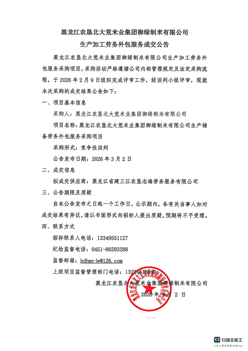 黑龍江農墾北大荒米業集團御綠制米有限公司生產加工勞務外包服務成交公告