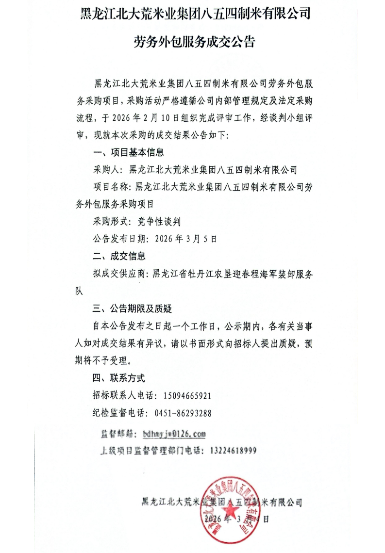 黑龍江北大荒米業(yè)集團(tuán)八五四制米有限公司勞務(wù)外包服務(wù)成交公告
