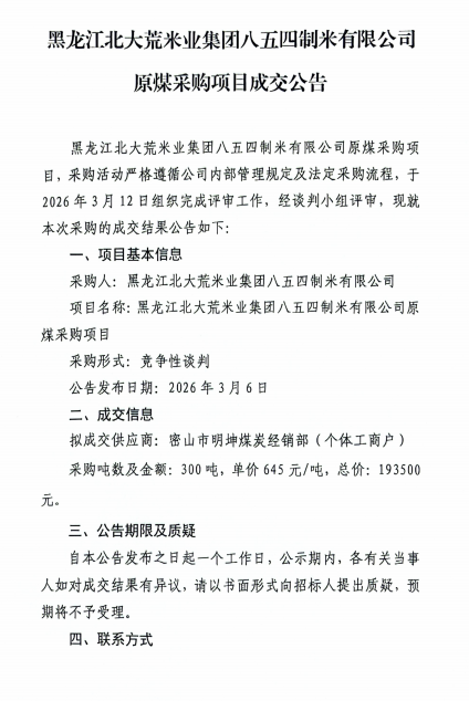 黑龍江北大荒米業集團八五四制米有限公司原煤采購項目成交公告
